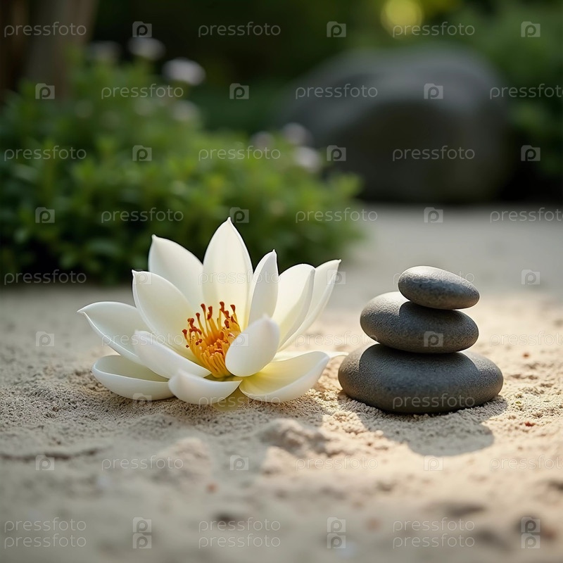 Гладкие камни тщательно сложены рядом с нежной белой лилией в спокойной обстановке сада. Мягкий солнечный свет фильтрует зелень, усиливая мирную атмосферу. Генерирующий ИИ
