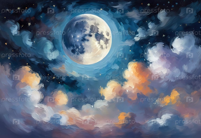 Полнолуние освещает ночное небо, наполненное пушистыми облаками, окрашенными в различные оттенки синего, фиолетового и мягкого белого. Движущиеся звезды добавляют волшебный штрих к этой безмятежной сцене. Генерирующий ИИ
