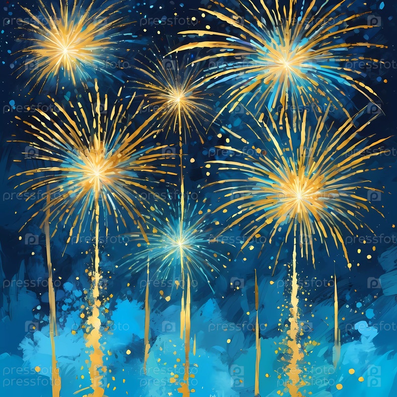 Красочные фейерверки освещают ночное небо, когда люди празднуют Новый год. Вспышки золота и синего цвета вызывают радость и волнение, отмечая новый старт. Фейерверки взрываются на темном небе. Генеративный ИИ
