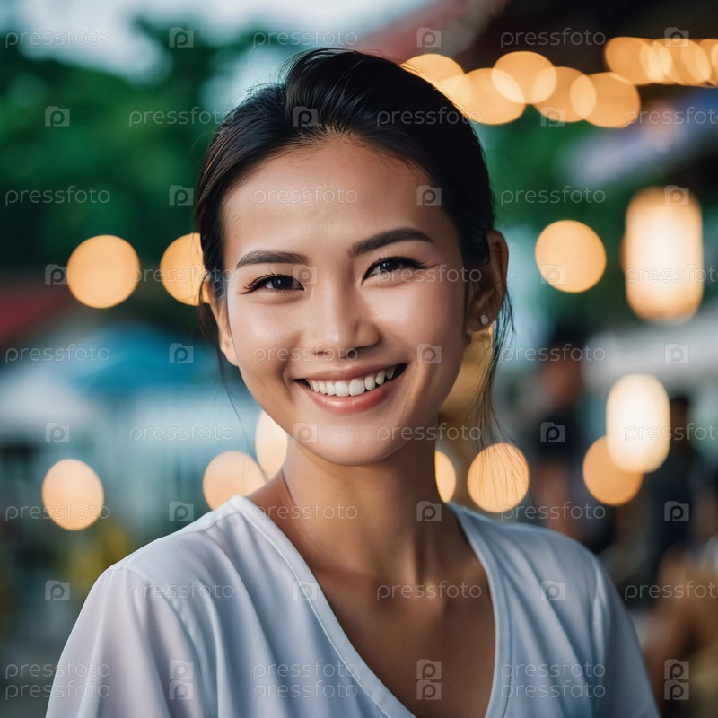 Веселая женщина тепло улыбается в окружении размытых красочных огней в яркой обстановке в Таиланде. Ее радость и живой дух отражают атмосферу местности. Генерирующий ИИ