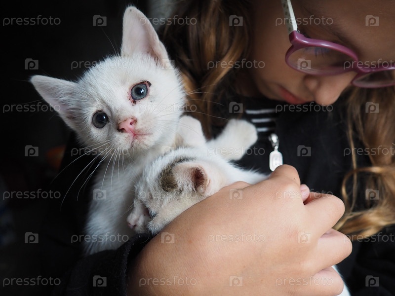 Белый котенок радостно взаимодействует руками ребенка, демонстрируя игривое поведение. Уютная обстановка в помещении усиливает тепло этого восхитительного момента, наполненного смехом и весельем. Две кошки