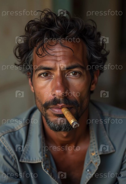 Молодой человек, проживающий на Кубе, курит сигару, глядя прямо на зрителя, демонстрируя уникальную прическу и спокойное поведение в яркой обстановке. Генеративный ИИ