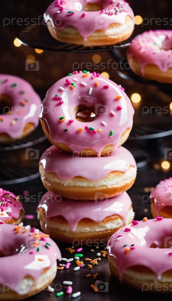 Восхитительные клубничные розовые глазурованные пончики отображаются на деревенском деревянном фоне. Посыпки и конфетные украшения добавляют яркие цвета, создавая праздничное угощение. Генерирующий ИИ