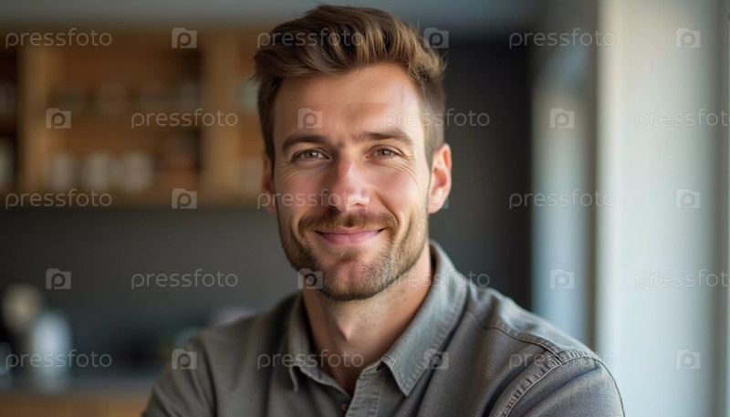 Веселый молодой симпатичный мужчина 30 лет, житель США, с короткими волосами и ухоженной бородой тепло улыбается во время ношения повседневной одежды. Мягкое освещение улучшает дружественную атмосферу. Генерирующий ИИ