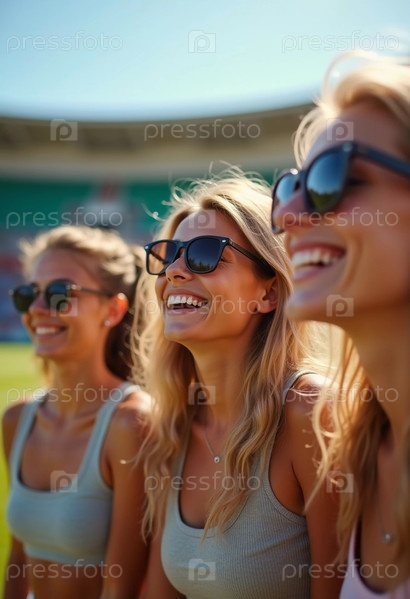 Трое друзей ярко улыбаются и делятся радостным смехом, наслаждаясь ярким днем на стадионе. Теплое солнце усиливает их духовную связь и счастливые воспоминания