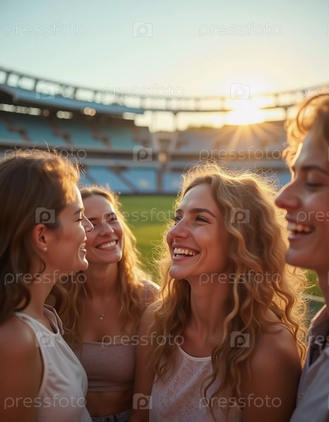 Радостные друзья наслаждаются смехом на фоне оживленного стадиона, золотистым закатом, освещающим их лица, создавая незабываемые связи и связи