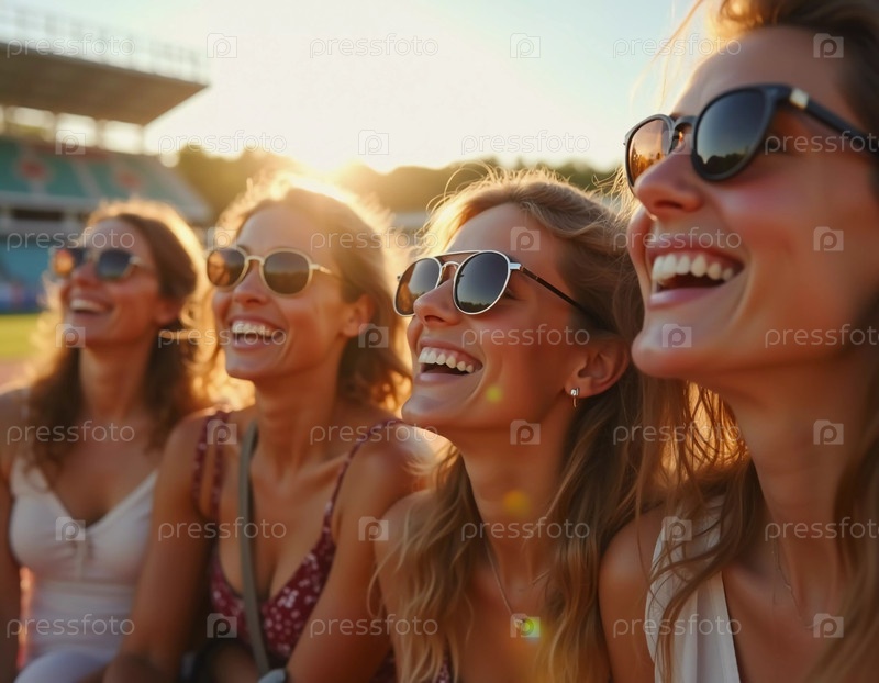 Группа друзей наслаждается восхитительным днем на спортивном стадионе, делясь смехом, когда солнечный свет фильтрует их улыбки. Их выражения отражают радость дружбы и совместного опыта