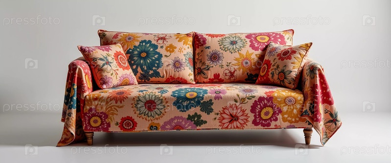 Яркие красные цветочные мотивы украшают крышку дивана, наполняя интерьер теплом и весельем. Солнечный свет мягко фильтруется через окно, подчеркивая живые узоры и предлагая комфорт
