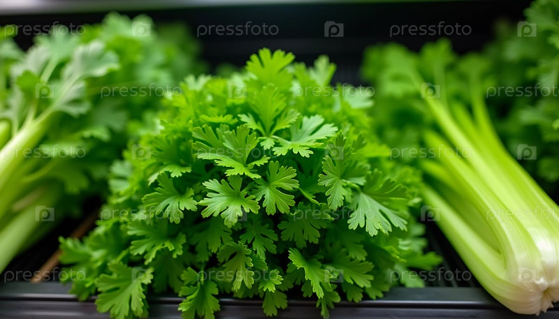 Яркая зеленая петрушка и хрустящий сельдерей художественно расположены на стойке супермаркета, приглашая покупателей взять свежие ингредиенты для своего следующего кулинарного приключения