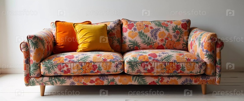 Веселое жилое пространство демонстрирует потрясающий ярко-красный цветочный диван, украшенный яркими подушками, приглашая к расслаблению и радости в художественной домашней обстановке