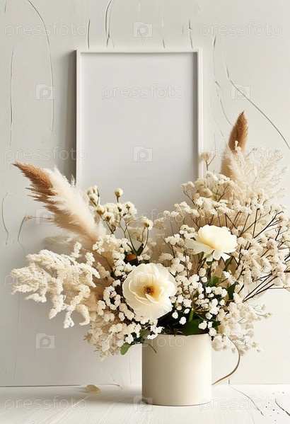 Успокаивающий цветочный дисплей с гипсофилой и белыми цветами открытки, элегантно расположенные в простом контейнере Generative AI