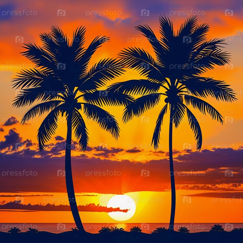 Золотые лучи заходящего солнца освещают силуэты пальм на фоне яркого неба. Этот захватывающий момент предвещает конец безмятежного дня океаном Генеративного ИИ