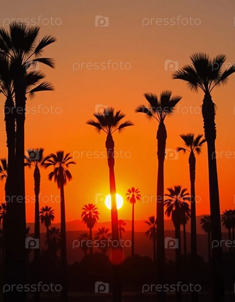 Золотые лучи разливаются по горизонту, когда пальмы силуэт на фоне потрясающего заката. Вечернее небо преображается богатыми апельсинами и мягкими желтыми, приглашая безмятежность Генеративного ИИ
