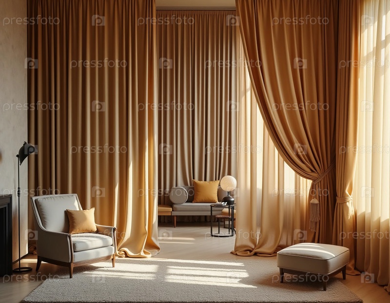 Мягкие золотые шелковые шторы обрамляют большие окна, освещая шикарное жилое пространство уютным креслом и современной мебелью, создавая привлекательную атмосферу Generative AI