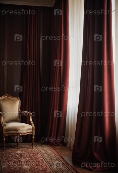 Богатые оттенки шелковых занавесок элегантно обрамляют яркое окно, в то время как винтажный стул приглашает расслабиться в уютном уголке, излучая тепло и очарование