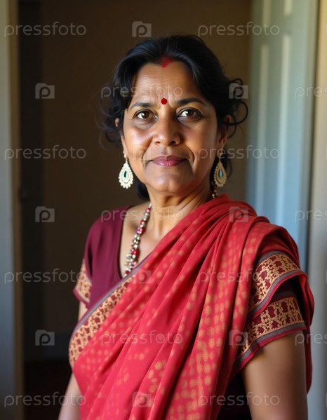 Очаровательная индийская женщина, украшенная ярким сари, изящно стоит в помещении и демонстрирует свою культурную одежду с спокойной улыбкой
