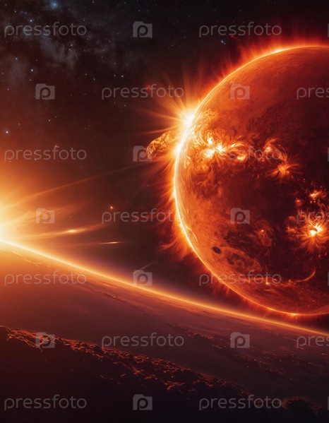Сияющий свет вспыхивает от далекого солнца, освещая космический пейзаж. Планета, украшенная огненными извержениями, демонстрирует красоту Вселенной в завораживающей встрече