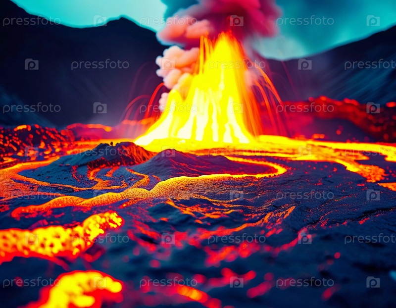 Светящаяся лава вытекает из вулкана, создавая завораживающее отображение огненно-красных и оранжевых оттенков. Толстые шлейфы пепла поднимаются в небо, рисуя драматический фон Генеративный ИИ