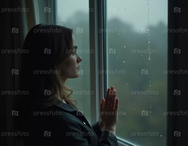 Молодая женщина стоит у окна, ее руки прижаты к стеклу, наблюдая за дождем, падающим снаружи Генеративного ИИ