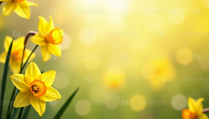 Цветы нарцисса ярко сияют в желтых оттенках, их нежные лепестки простираются наружу в праздновании весны. Купанный в мягком, мечтательном эффекте боке, размытый фон усиливает веселую атмосферу, создавая теплую обстановку, которая приглашает к спокойствию