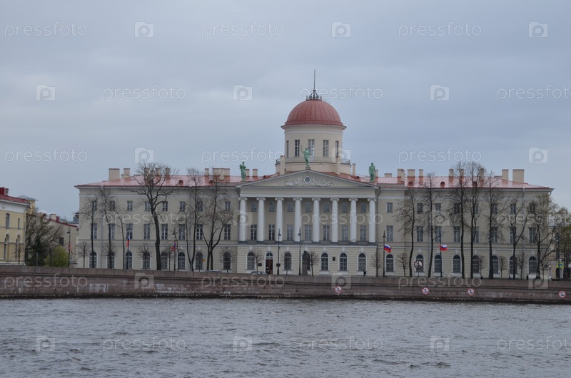 Здание Петербургской портовой таможни, в настоящее время Институт русской литературы РАН («Пушкинский дом») и Литературный музей на набережной Макарова в Санкт-Петербурге в весенний пасмурный день