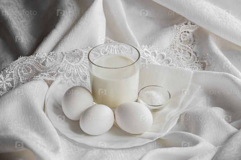 Стакан молока, вареные яйца и соль в солонке на тарелке на светлой скатерти с ажурной каймой