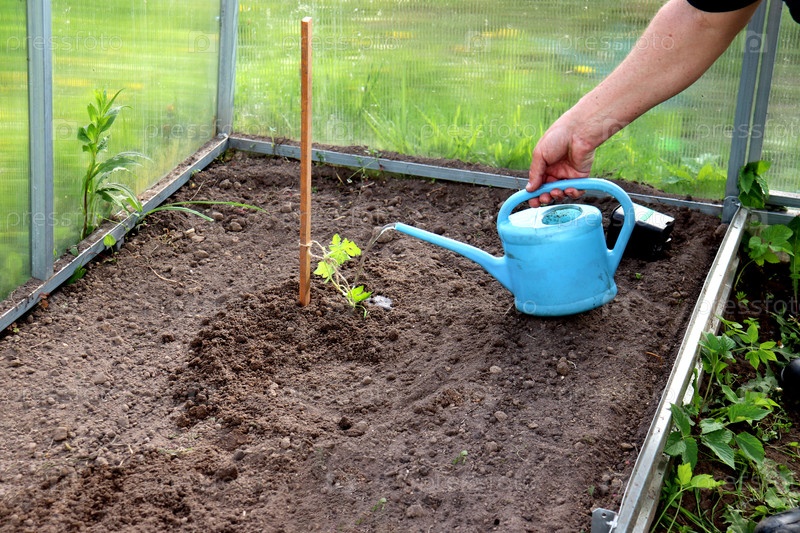 Рука фермера поливает из небольшой лейки посаженный в теплице росток арбуза