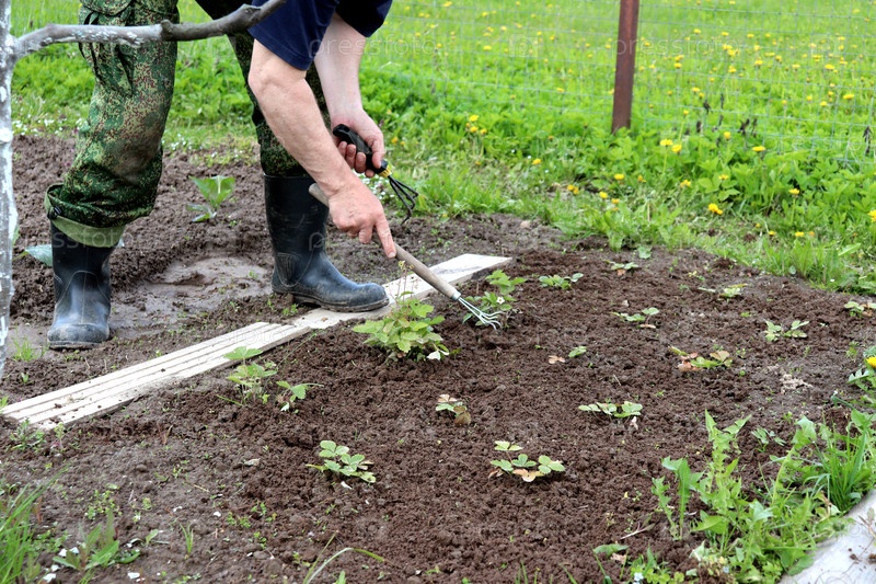 Пожилой фермер наклонился над грядкой с кустами клубники, пропалывает сорняки и рыхлит почву цапкой