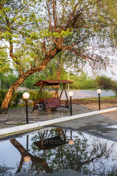 Деревянные качели под деревом в парке с отражением в воде