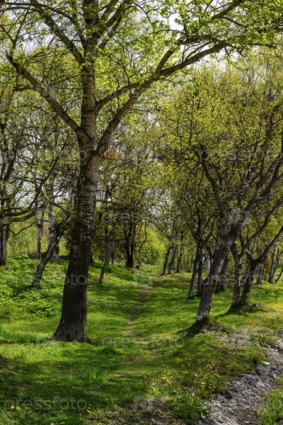 Тропинка в зеленом лесу. Весенний пейзаж с зелеными деревьями