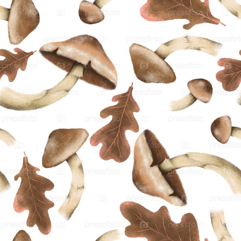 Бесшовный узор с осенними листьями и грибами, идеально подходит для сезонного текстиля, обоев, оберточной бумаги, поздравительных открыток и домашнего декора. Идеально подходит для добавления уютного осеннего прикосновения к любому творчеству