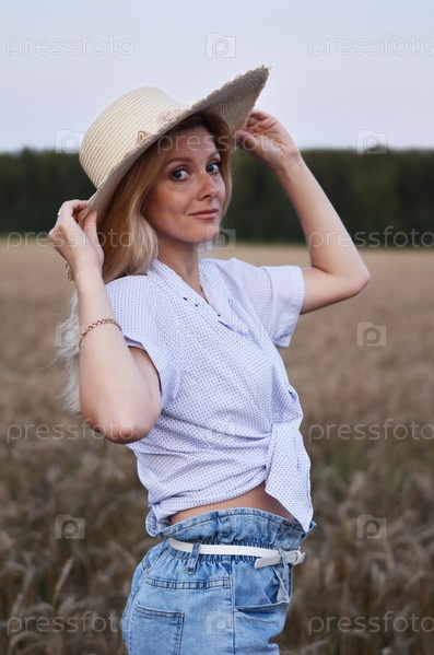 Молодая женщина наслаждается беззаботным моментом на пшеничном поле возле леса во время заката