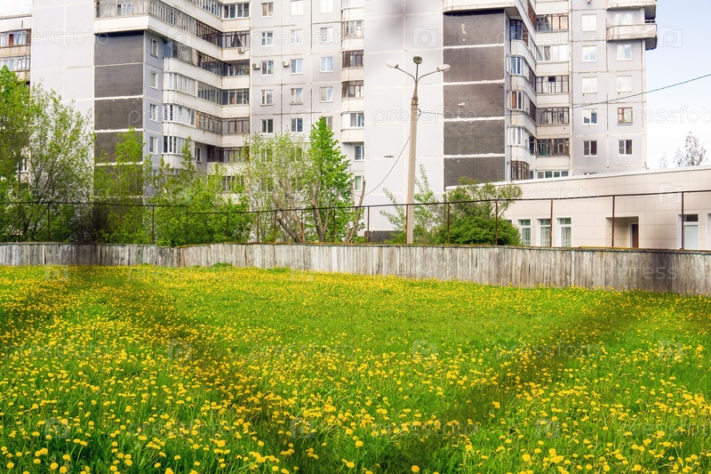 Открытый хоккейный каток, заросший травой и цветами вне сезона, вид через размытую сеть безопасности