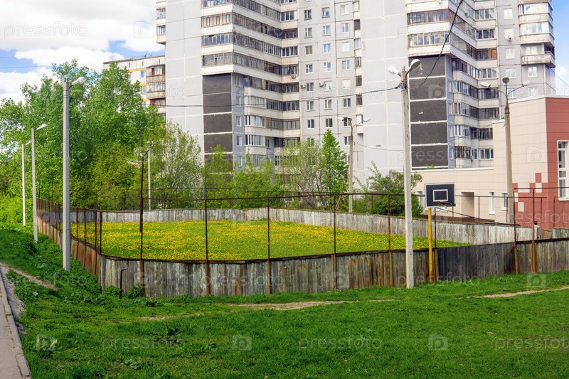Летний городской пейзаж с открытым хоккейным катком, заросшим травой и цветами вне сезона