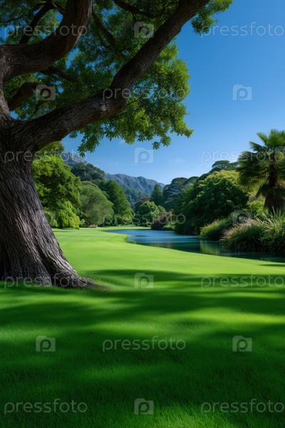 Вертикальный фоновый пейзаж, газон и старое дерево в тропическом парке