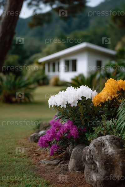 Клумба с яркими цветами на размытом фоне дома