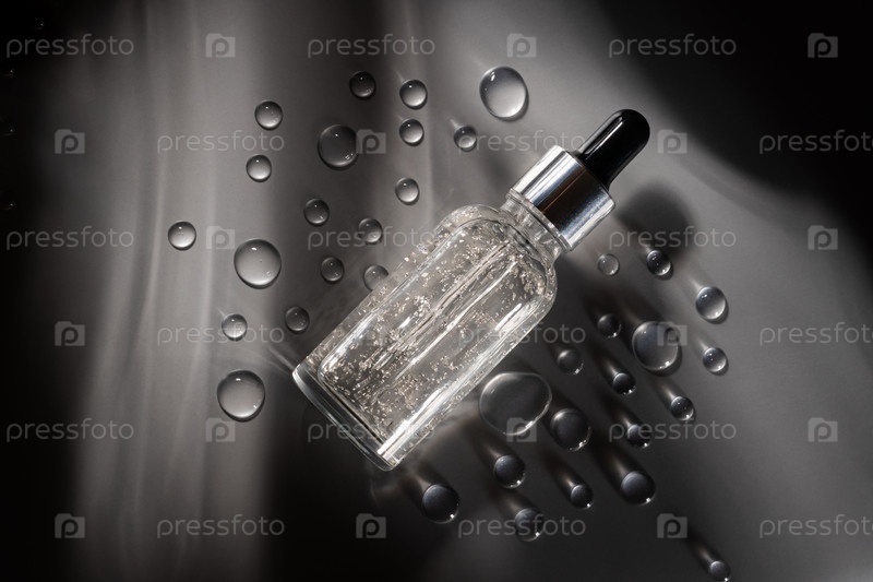 Высокоугольный вид стеклянной бутылки капельницы с красивым лицом масло на сером фоне с каплями воды вокруг. Антивозрастная сыворотка с активными ингредиентами аргента