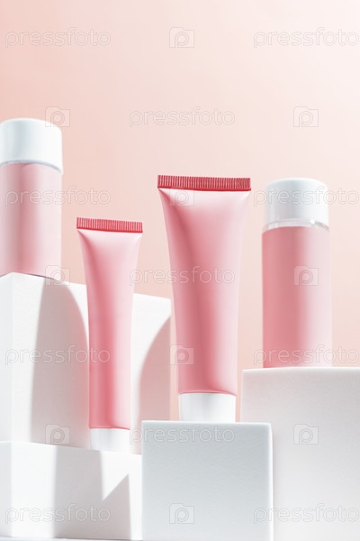 Набор косметических продуктов в розовых трубах и бутылках на белых подиумах на розовом фоне. Уход за кожей установлен для повседневной рутины. Мокап для дизайнеров