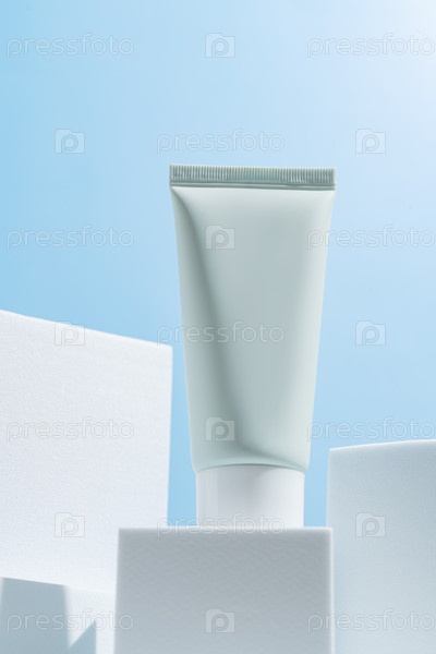 Макет продукта красоты. Оздоровительная упаковка. Брендинг спа. Косметический на синем фоне. Бутылка с кремом, лосьон, мусс, чистильщик, шампунь для ухода за кожей. Копировать пространство