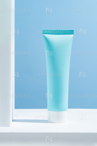 Косметическая упаковка. Голубая пластиковая трубка из крема на белых подиумах. Бланковая упаковка. Концепция натурального косметического продукта. Красота. Вздор