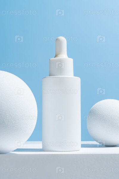 Лицевая сыворотка в стеклянной капельнице на белом подиуме и шарики на синем фоне. Естественный косметический уход за кожей. Концепция рутины красоты. Минимальный состав. Модный продукт для брендинга