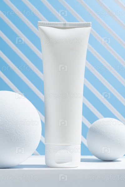 Белый макет косметической трубы. Пластиковая упаковка для косметологии кремового изделия на белом подиуме на синем фоне. Концепция Skincare