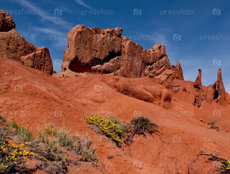 Северный Кыргызстан. Живописные виды на знаменитый каньон Сказка, глинистые горные вершины которого окрашены в яркие цвета от желтого до красно-коричневого