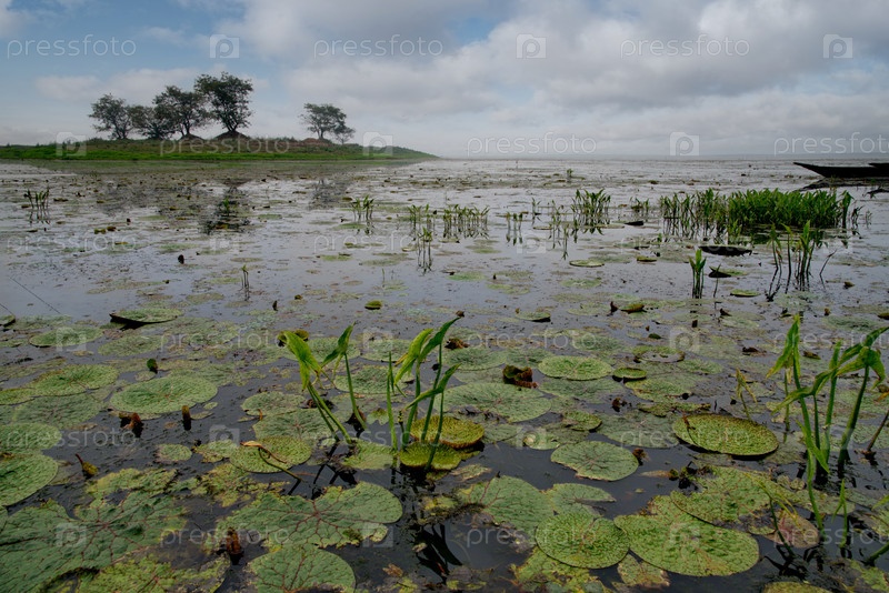 Восточная Индия. Вид на живописное заболоченное озеро в долине реки Брахмапутра возле рыбацкой деревни