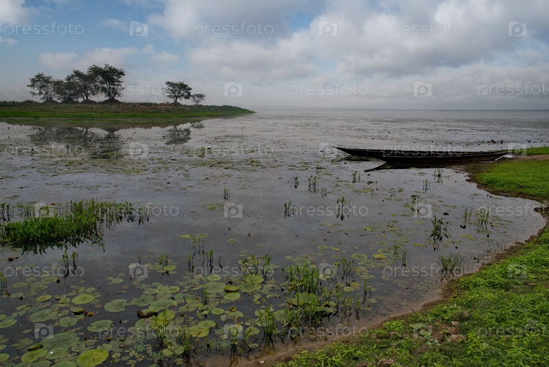 Восточная Индия. Вид на живописное заболоченное озеро в долине реки Брахмапутра возле рыбацкой деревни