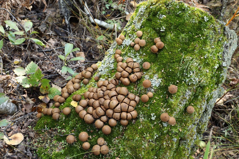 На старом стволе, покрытом зеленой мхом, в солнечный летний день растут дождевики (лат. lycoperdon)
