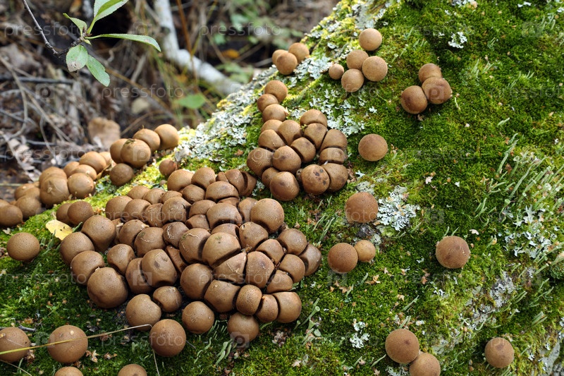 Круглые грибы-дождевые (лат. lycoperdon) росли среди мха в летнем лесу