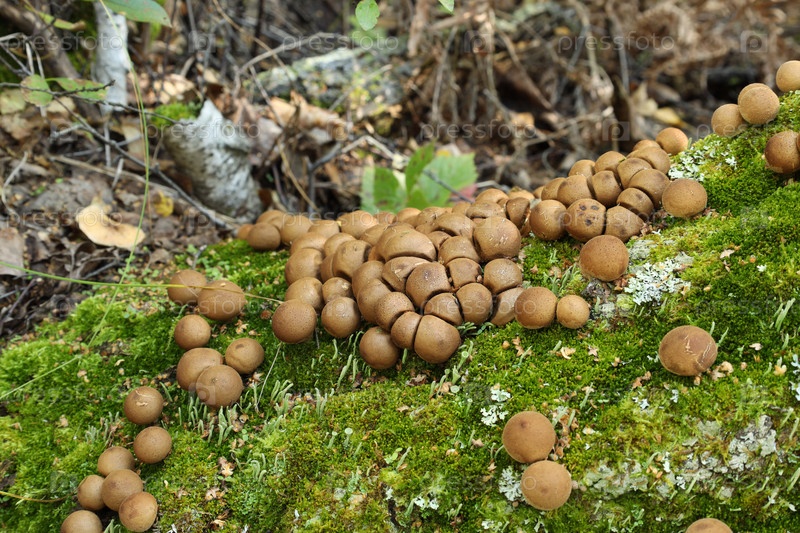 Семья ликопердонов (Lycoperdon) растет в летних лесах под ярким солнцем