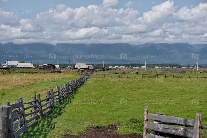 Россия. Республика Бурятия. Вид на поля в долине реки Иркут, огороженные деревянным забором особой конструкции из досок и бревен