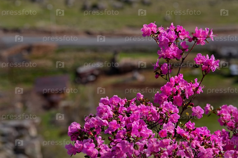 Россия. Горный Алтай. Цветущий куст рододендрона Ледебура (маральник) на склонах гор вдоль Чуйского тракта в районе поселка Купчегень